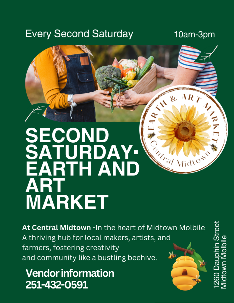 Mark your calendars to join us every month for our Second Saturday – Earth and Art Market Central Midtown-In the heart of Midtown Mobile. 1260 Dauphin Street